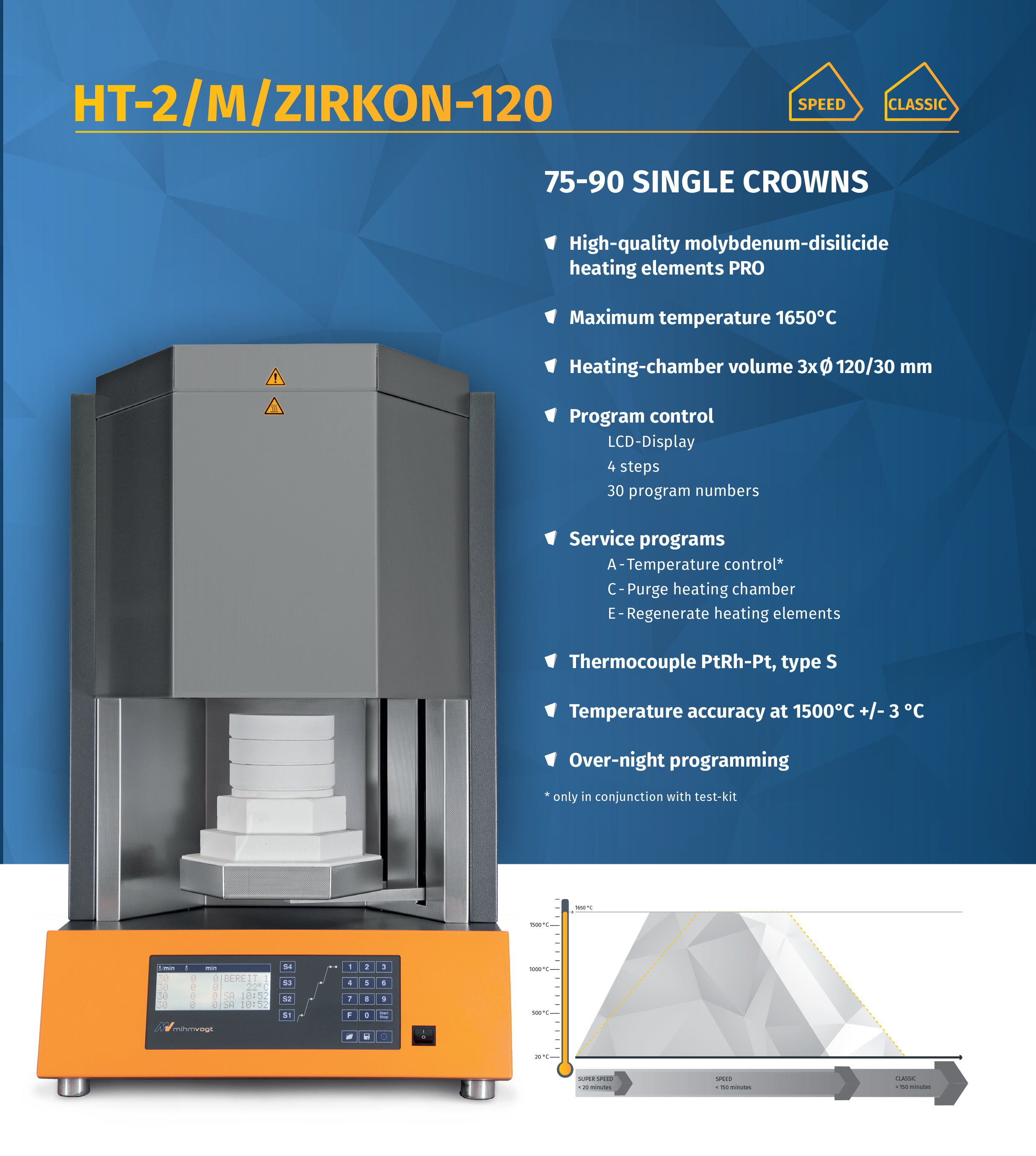 In addition to all of these benefits, all the functions included on our standard sintering furnaces are also available. The intelligent electronics on the Mihm-Vogt speed sintering furnaces automatically detect whether you are using a standard program or a speed program.